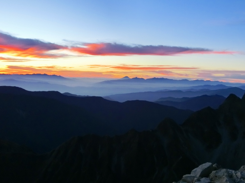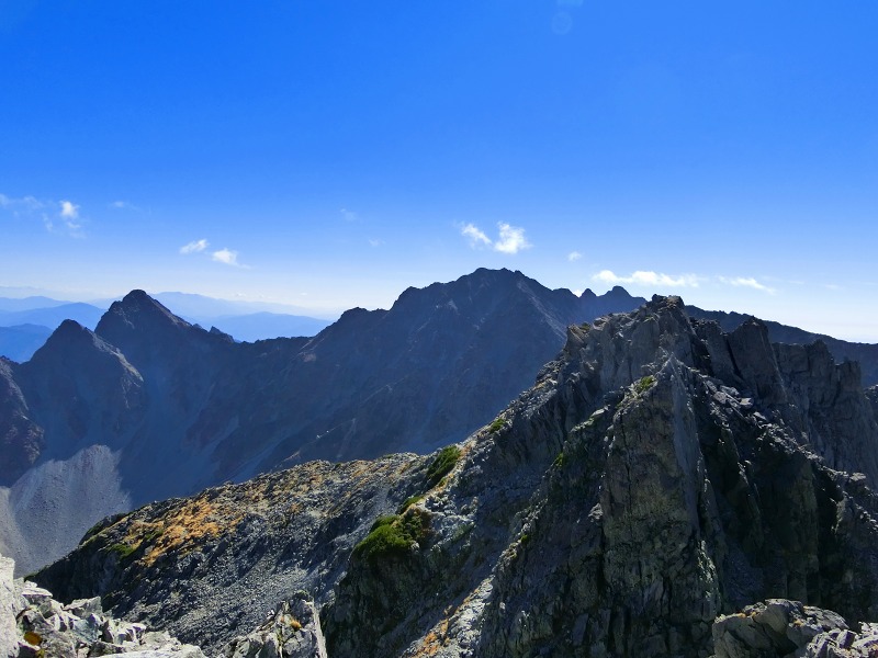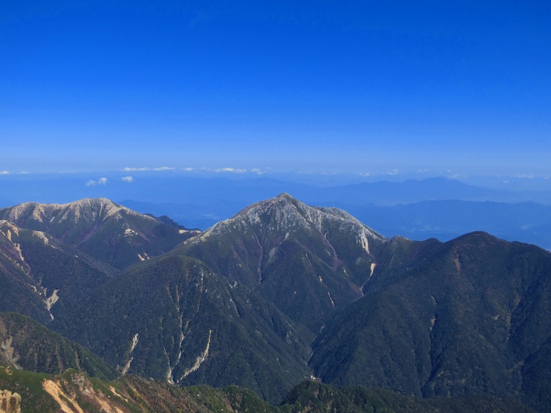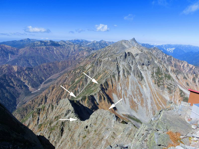 槍ヶ岳の手前には、来年登頂予定の 標高 第10位の大喰岳(3,101m) や 第12位の中岳(3,084m)。 |