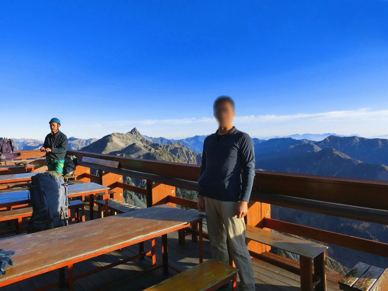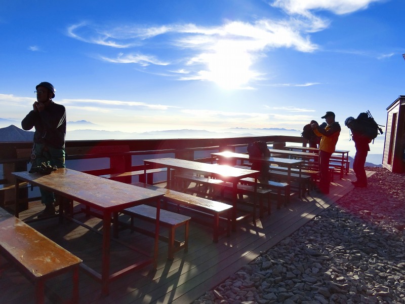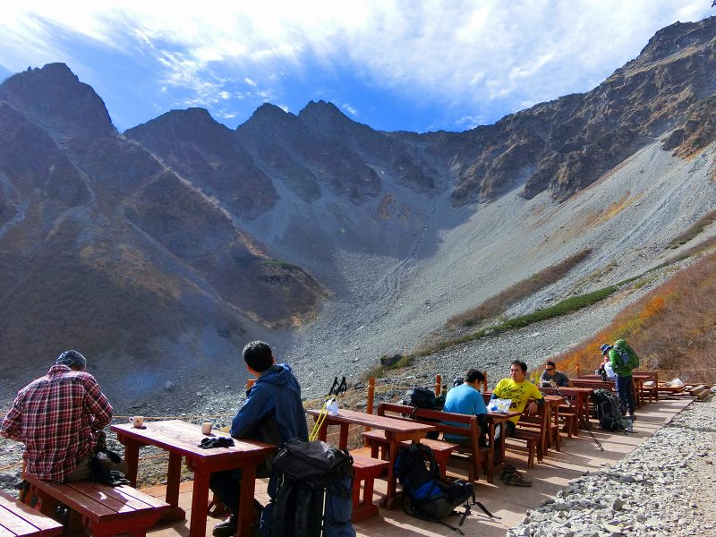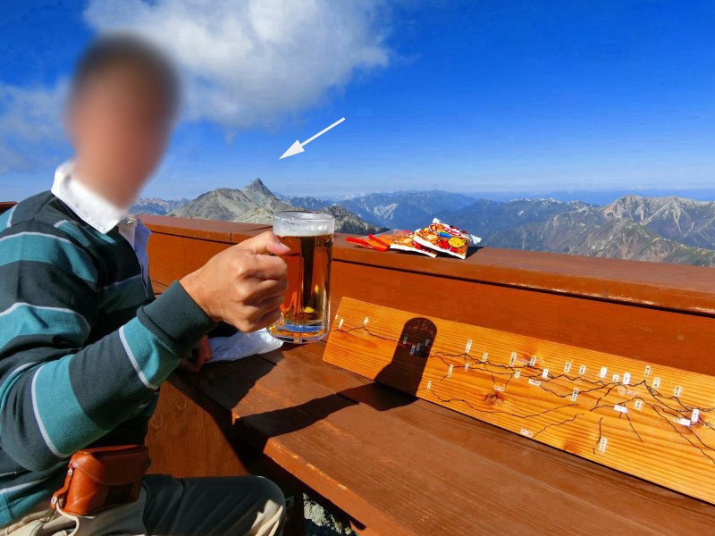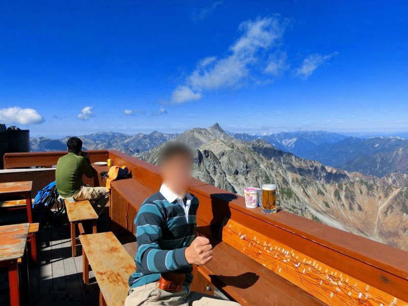 | 今まで宿泊した山小屋の中で、眺望は 断トツで No.1。 秋日和の下、標高 3,100mの「雲上のテラス」で 槍ヶ岳を眺めながら 生ビールを頂くなんて … ホント 贅沢(ぜいたく)だなぁ。 |