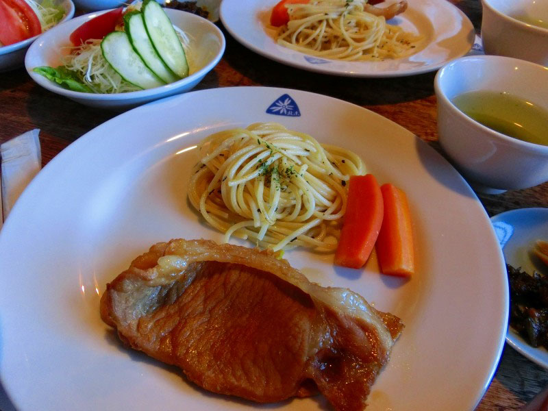 夕食は 北穂高小屋の名物「豚の生姜焼き」、にんじんのグラッセ、バジルのスパゲティ。 |