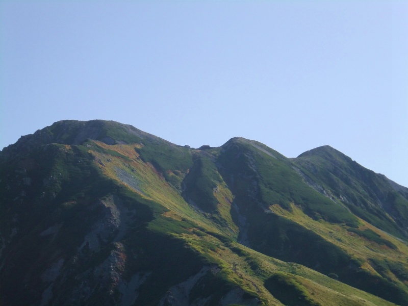 | 6時45分、出発。腰痛は 一時的に起こる程度で まずまず良好。 中腹まで下降。宿泊した剱御前小舎があんな所に。 |