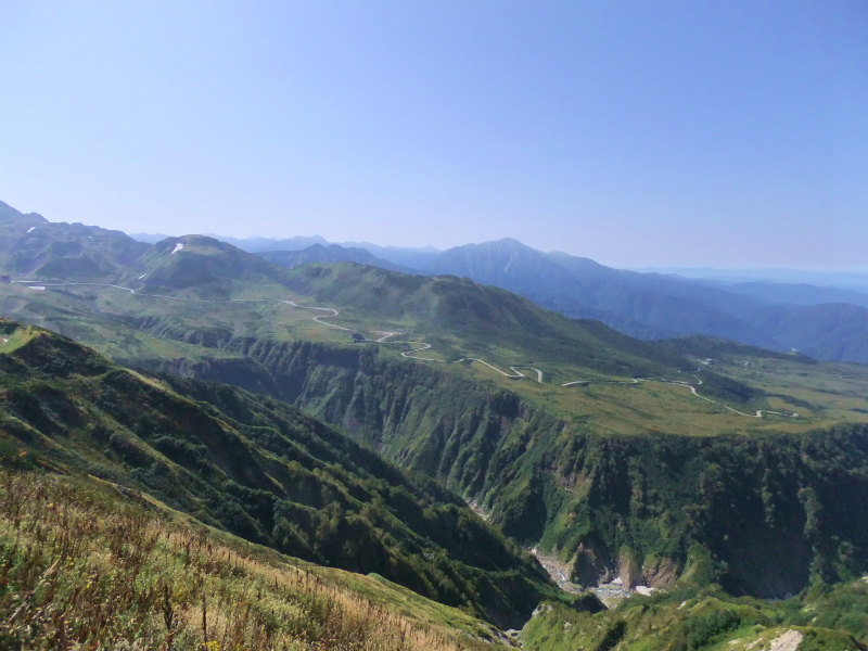 | 随分 西へ来ました。南を向けば、立山・黒部アルペンルートの有料道路。 見事なまでに 九十九折り(つづらおり)だこと。 |