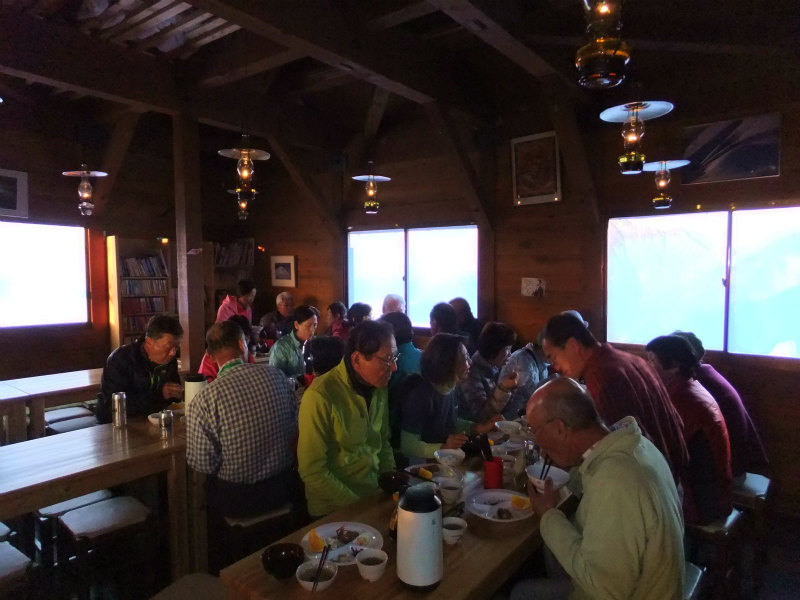 | 9割方 埋まっていました。平日だからか 60代以上が殆ど、しかも 登山歴の長いベテランばかり。 山の話にも 深みがあります。 |