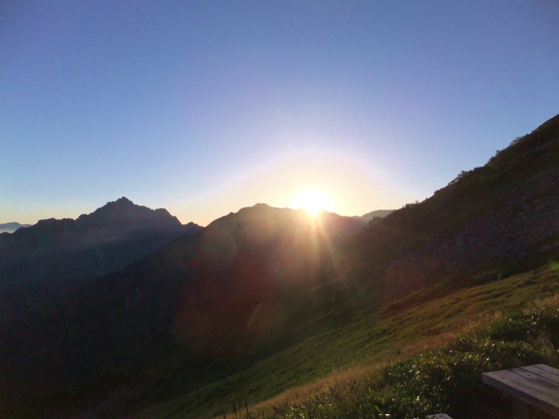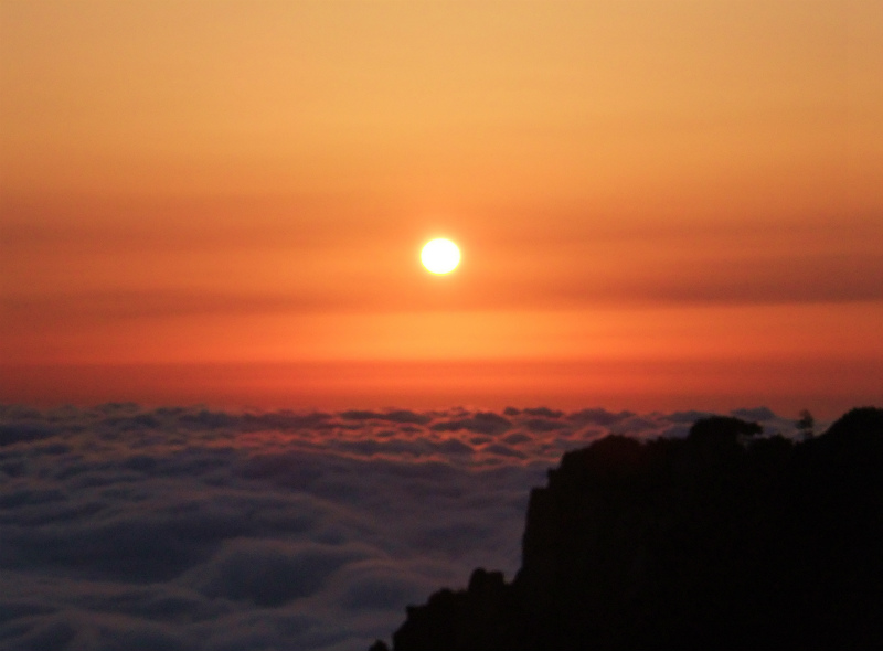 | 東雲(しののめ)の空、神々しい御来光です。強烈な光を放ち、一気に姿を現します。 | |